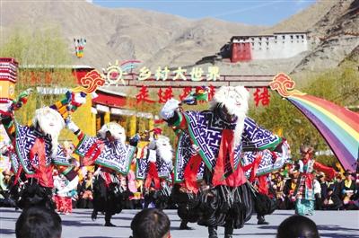 圖為國家級非物質(zhì)文化遺產(chǎn)瓊結(jié)奔堆白面藏戲演員在舞臺上表演。倫珠次仁 洛桑 攝