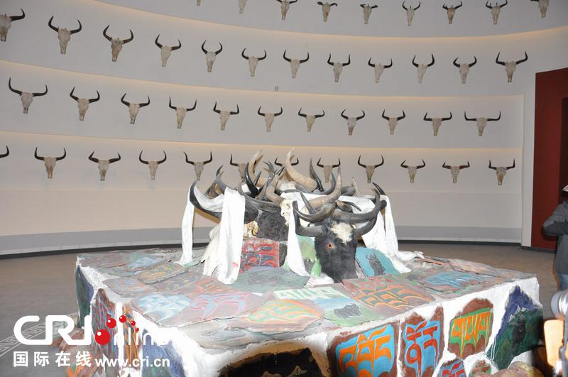 西藏牦牛博物館一共分四個(gè)廳:感恩牦牛、探秘牦牛、相伴牦牛、靈美牦牛。十世班禪大師生前說過:“沒有牦牛就沒有藏族”,深刻地揭示了牦牛與藏族密不可分的關(guān)系。感恩牦牛展廳運(yùn)用轉(zhuǎn)經(jīng)筒、牦牛頭骨、瑪尼堆、場景畫、壁畫等形式,表達(dá)了藏族人民對牦牛的感恩和崇敬。圖為感恩牦牛展廳中的展品--自然死亡的野牦牛頭部。圖片來源:國際在線