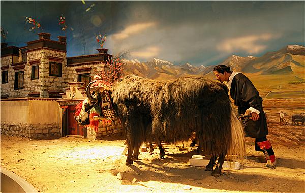西藏牦牛博物館是北京市對口支援拉薩市的一項(xiàng)重要文化創(chuàng)意工程,位于拉薩河南岸柳梧新區(qū),建筑面積8088平方米,加上室外展區(qū),總面積達(dá)10000多平方米,各種藏品數(shù)千件。作為世界上第一個(gè)以牦牛為主題的博物館,西藏牦牛博物館不僅具有收藏、保存、展示、科研、教育、服務(wù)等基本功能,也是保存牦牛文化物證、傳播牦牛文化知識(shí)、探究牦牛與人類發(fā)展相互依存關(guān)系的公益性公共文化機(jī)構(gòu)。圖為牦牛博物館展示的物品。圖片來源:中國西藏網(wǎng)