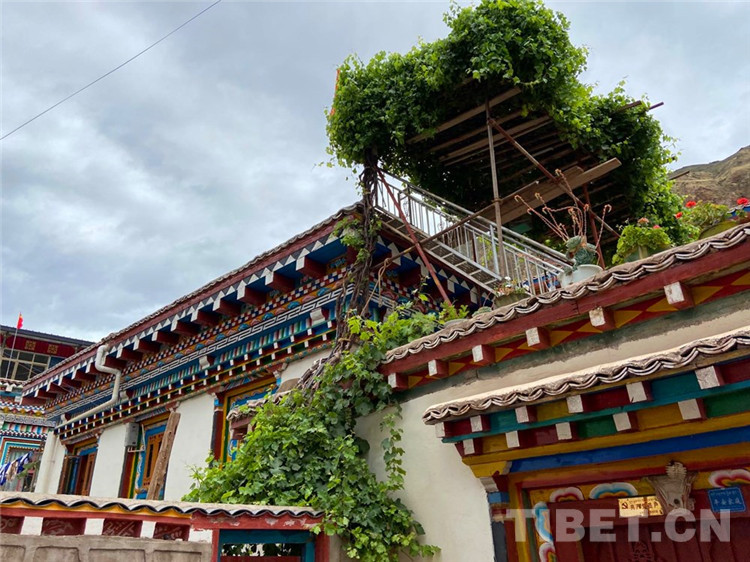 與同行者贊嘆一番,我的目光緩緩下移。在葡萄架側(cè)下方的房頂上,擺放著一排花盆。眾人皆知藏族愛花,即使在冬季,居民也會(huì)在陽臺(tái)養(yǎng)著幾盆花。如今進(jìn)入雨季,主人把一盆盆花兒搬上房頂,與遠(yuǎn)方的朋友共享好時(shí)光。