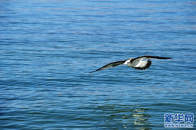 鳥(niǎo)兒在班公湖上空翱翔(10月19日攝)。新華網(wǎng) 張宸攝