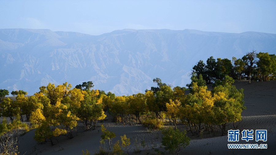披上了金黃色外衣的胡楊林,成為沙漠里的一抹亮色。新華網(wǎng) 潘彬彬攝