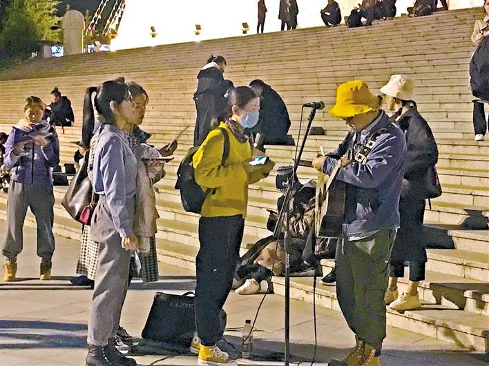 流浪歌手在劇場(chǎng)外傾情獻(xiàn)唱。
