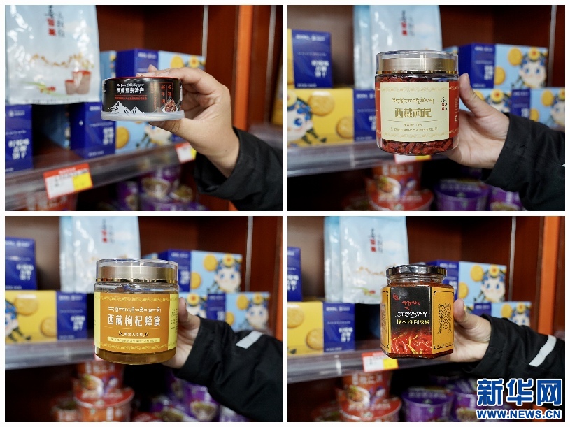 拼版照片:扶貧專柜內(nèi)擺放的日喀則特色產(chǎn)品(10月24日攝)。新華網(wǎng) 達珍 攝