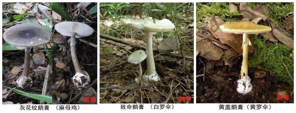 圖為劇毒鵝膏菌中的部分成員 圖片來源:云南省衛(wèi)生健康委員會、云南省疾病預防控制中心發(fā)布海報截圖拼接