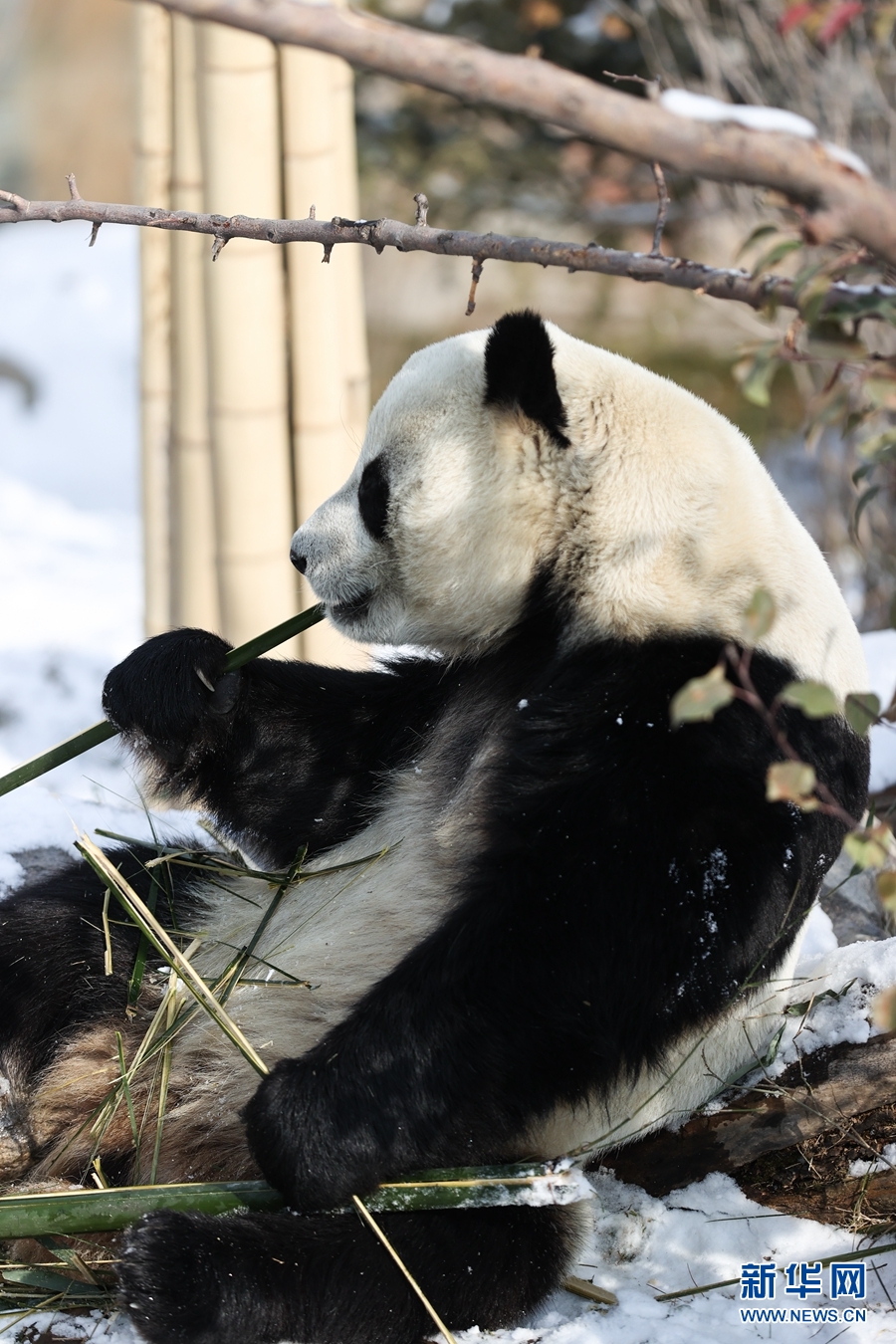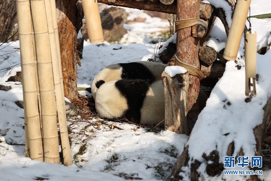 近日,受冷空氣影響,青海省西寧市迎來降雪。西寧熊貓館的四只大熊貓?jiān)谘┨炖锵硎苤灾褡?、“打盹兒”的樂趣?/p>