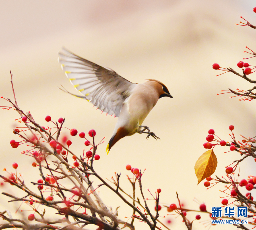 一群太平鳥正在“享用”海棠果。新華網(wǎng)發(fā)(李崇軒攝)
