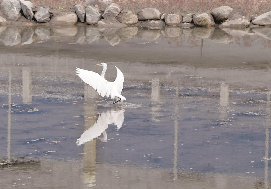 “咕、咕、咕……”11月25日13時(shí)許,走進(jìn)西寧南川河與湟水河交匯處,在清澈見底的河道里,一只大白鷺正悠然自得地來回踱步,獨(dú)自覓食,不時(shí)發(fā)出陣陣歡快的叫聲。