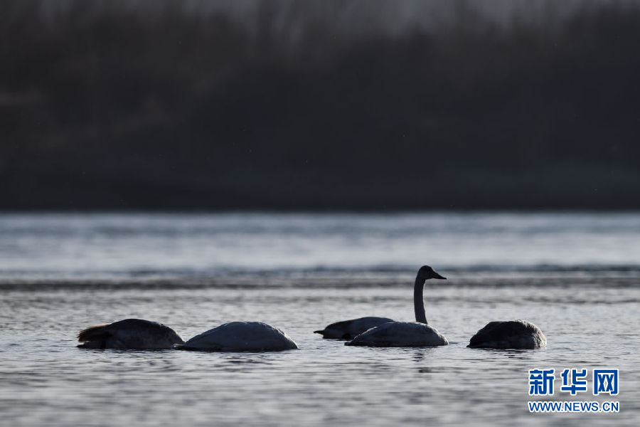 12月11日,幾只大天鵝在青海省貴德縣境內(nèi)的黃河里覓食。新華社記者 吳剛 攝