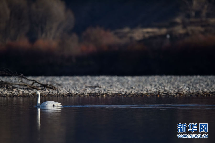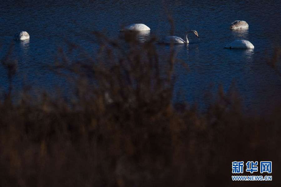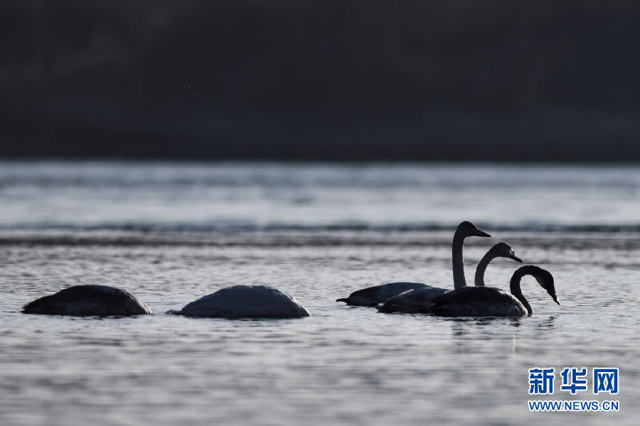 12月11日,幾只大天鵝在青海省貴德縣境內(nèi)的黃河里游弋。新華社記者 吳剛 攝