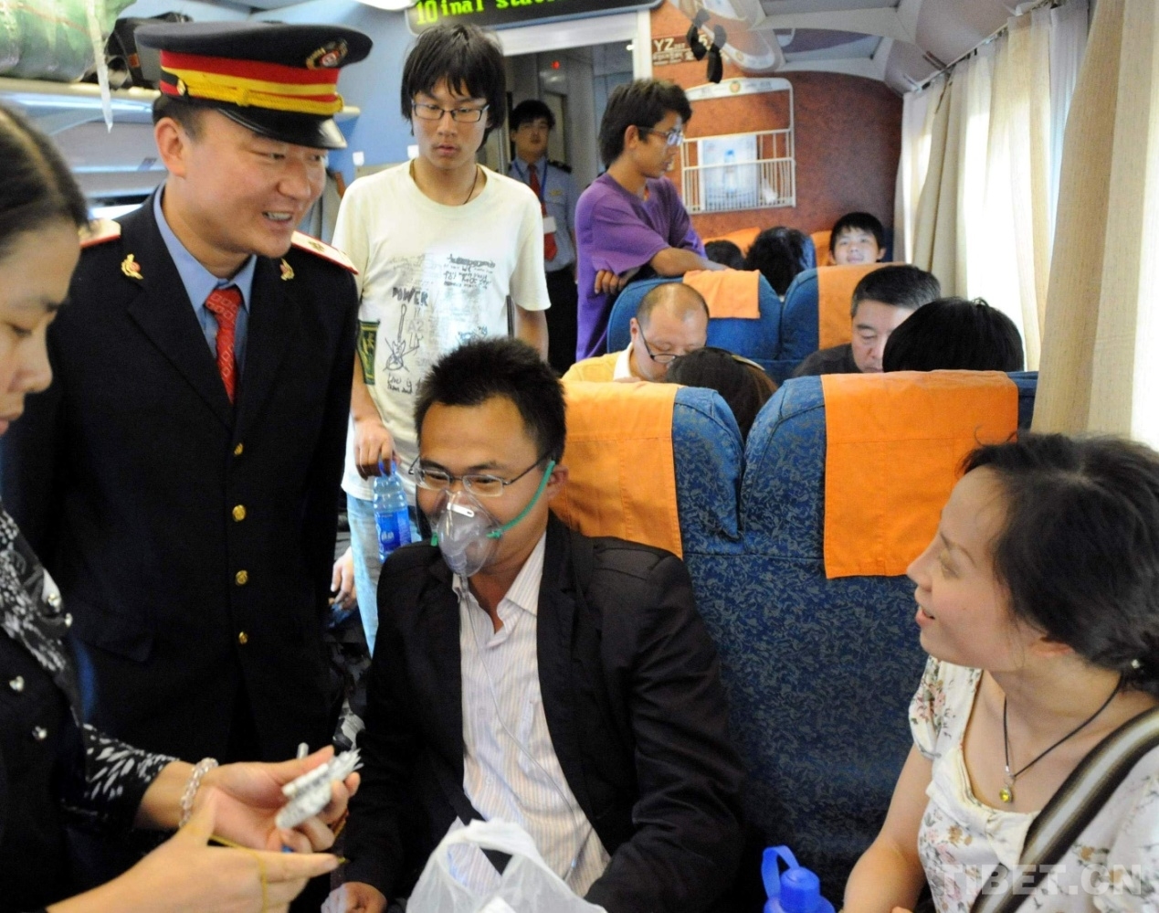 這是夫妻同在京藏列車上工作、被人們親切稱為“高飛的比翼鳥”的京藏車隊(duì)十一組列車長(zhǎng)王寶山為身體不適的旅客送上氧氣面罩(唐召明2010年8月22日攝)