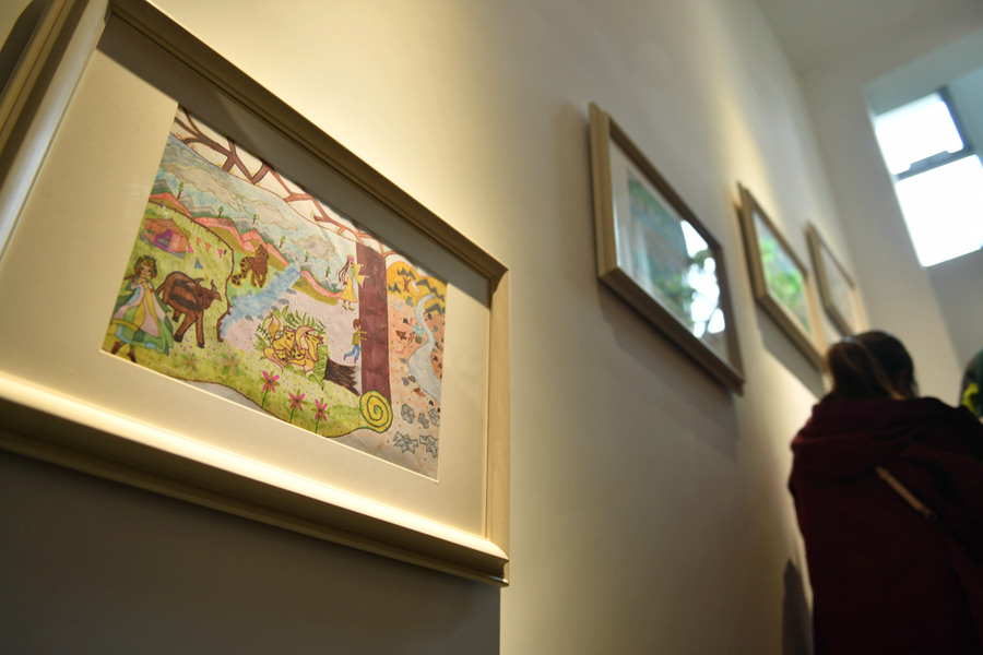 圖為祁連山國(guó)家公園青海片區(qū)展陳中心內(nèi)展出的兒童繪畫(huà)作品。