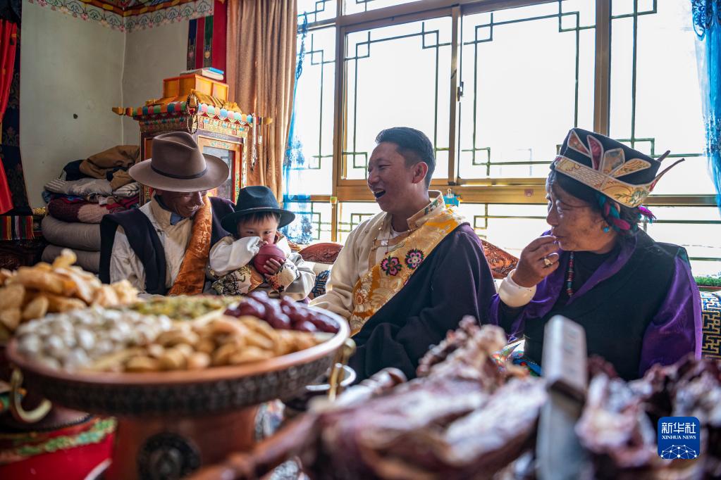 2月20日,在位于西藏拉薩市墨竹工卡縣門巴鄉(xiāng)的家中,扎西次仁(左一)一家在聊天、享用美食。新華社記者 孫非 攝