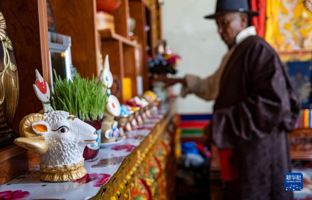 2月20日,在位于西藏拉薩市墨竹工卡縣門巴鄉(xiāng)的家中,扎西次仁用五彩青稞穗裝點象征吉祥的“切瑪”。新華社發(fā)(丁增尼達 攝)