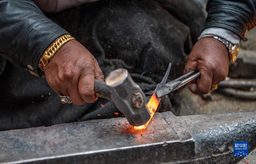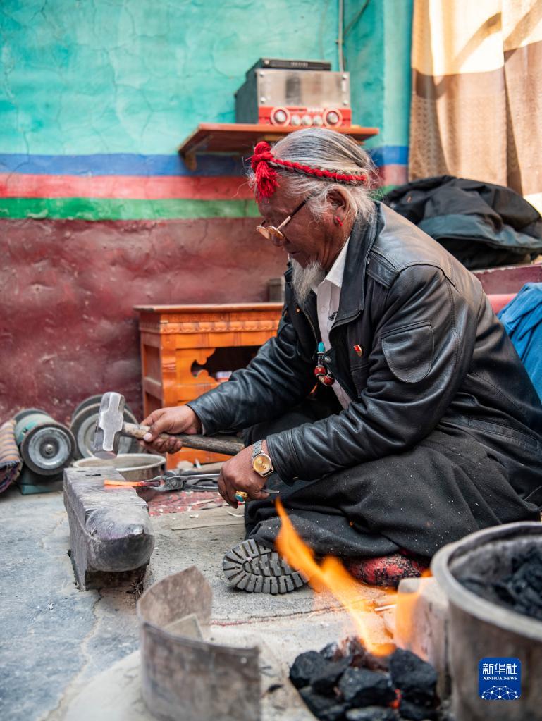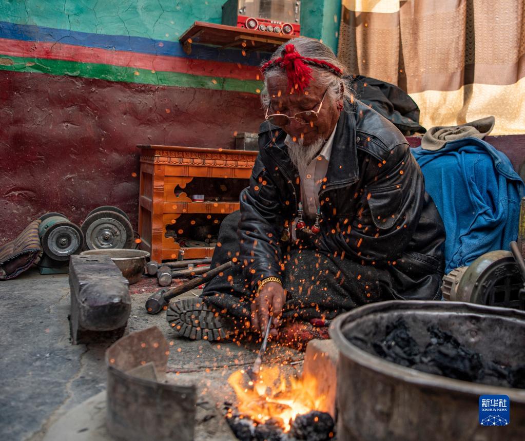 在拉孜縣柳鄉(xiāng)孜龍村,次旦旺加在制作藏刀(3月10日攝)。新華社記者 孫非 攝