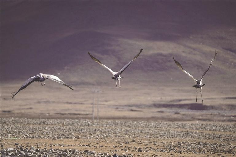 在西藏,黑頸鶴從越冬地到繁殖地有兩條線路:一條是拉薩到色林措,另一條則是從日喀則到色林措。整體來說,是從雅魯藏布江中游河谷黑頸鶴國家級(jí)自然保護(hù)區(qū)飛往色林措黑頸鶴保護(hù)區(qū),兩個(gè)保護(hù)區(qū)之間有一條固定的黑頸鶴遷徙路線,每年黑頸鶴會(huì)在3月中旬從越冬地雅江中游河谷及其支流拉薩河、年楚河流域的“一江兩河”地區(qū),飛去羌塘北部草原繁育后代;又會(huì)于11月中旬從繁殖地那曲的班戈縣、申扎縣、嘉黎縣,阿里的日土縣、普蘭縣,日喀則的昂仁縣,拉薩的當(dāng)雄縣返回到越冬地。對于雅江中游河谷來說,它是冬候鳥;對于羌塘北部草原來說,它是夏候鳥。