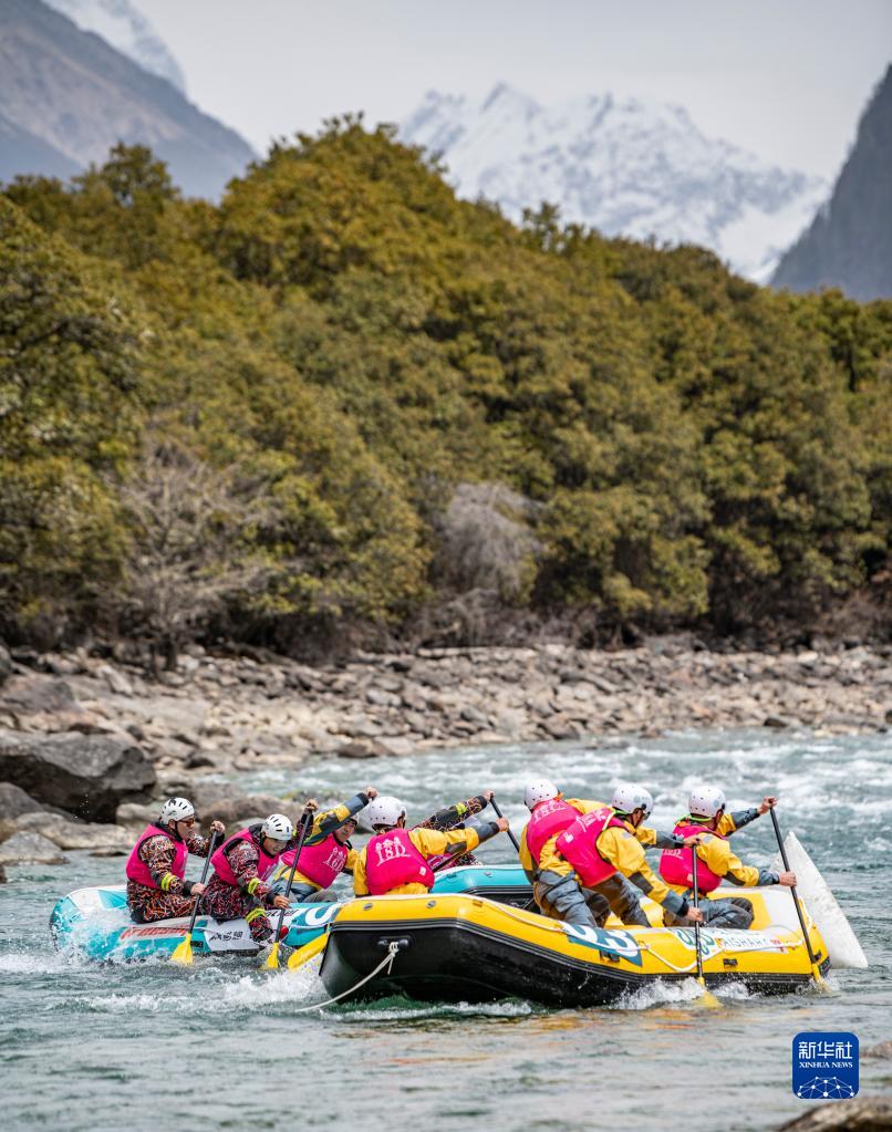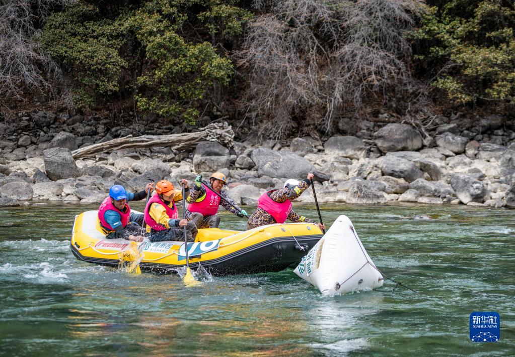 4月16日,“西藏旅游股份有限公司漂流隊(duì)”選手在激流漂流筏繞標(biāo)賽中,他們最終獲得季軍(無人機(jī)照片)。新華社記者 孫非 攝