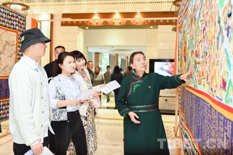 圖為格日勒老人(右)向嘉賓介紹“倉(cāng)央嘉措馬鬃繞線(xiàn)長(zhǎng)卷故事唐卡”