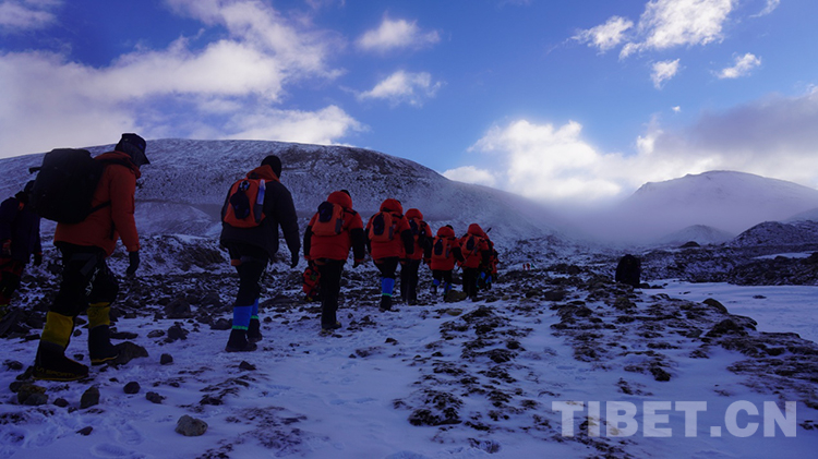 當(dāng)天凌晨4點(diǎn),西藏拉薩市當(dāng)雄縣羊八井鎮(zhèn)周圍還是一片寂靜之時,參加洛堆峰登山探險活動的山友們已從羊八井高山訓(xùn)練基地出發(fā)前往洛堆峰登山探險。經(jīng)過長達(dá)7小時30分左右的長途跋涉,第一批登山人員成功登頂海拔6010米的洛堆峰,此時金色的太陽早已籠罩大地,白皚皚的雪山聳立在大地之上,在陽光的照耀下顯得格外壯觀。