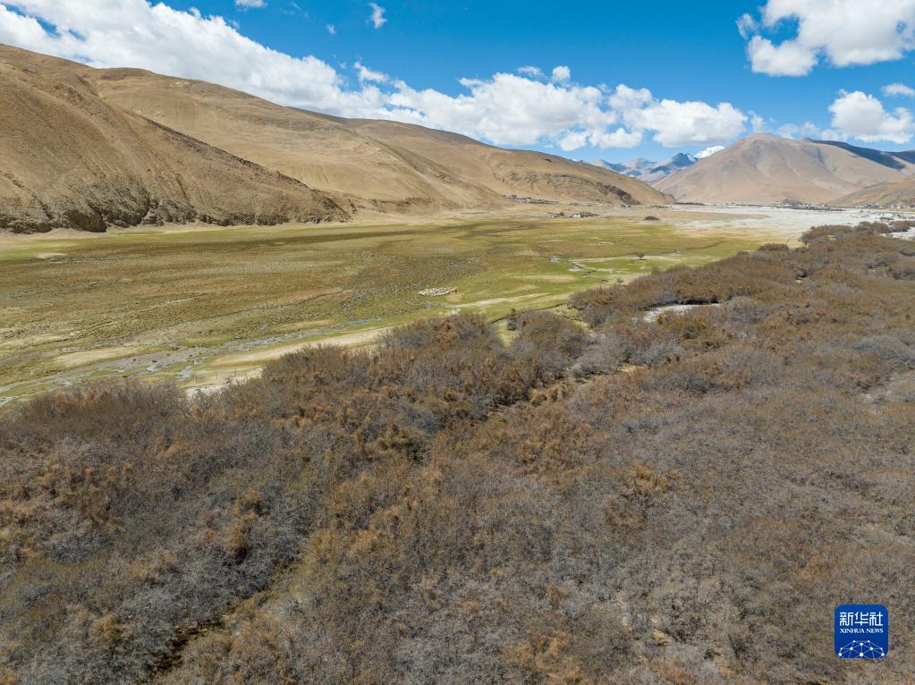 這是在珠峰國家級自然保護區(qū)內(nèi)拍攝的沙棘林和濕地(5月25日攝,無人機照片)。新華社記者 孫非 攝