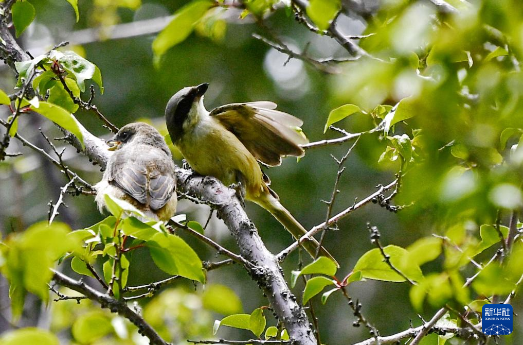 一只伯勞(右)和幼鳥在拉薩市城關區(qū)一處庭院的樹枝上(7月28日攝)。新華社記者 張汝鋒 攝
