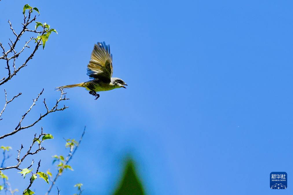 在拉薩市城關區(qū)一處庭院,一只伯勞飛離枝頭(7月28日攝)。新華社記者 張汝鋒 攝