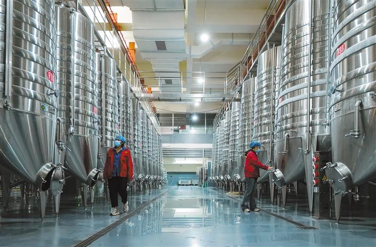 工作人員在車間查看葡萄酒釀造情況。