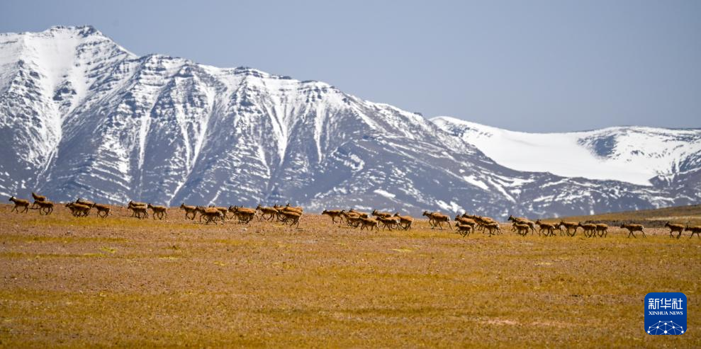 在羌塘國(guó)家級(jí)自然保護(hù)區(qū)核心區(qū)拍攝的遷徙中的雌藏羚羊群(6月9日攝)。新華社記者 旦增尼瑪曲珠 攝 ??