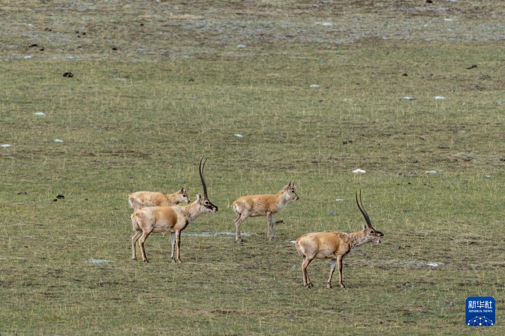在羌塘國(guó)家級(jí)自然保護(hù)區(qū)核心區(qū)拍攝到的雄性和亞成體雌性藏羚羊(6月9日攝)。新華社記者 旦增尼瑪曲珠 攝 ??