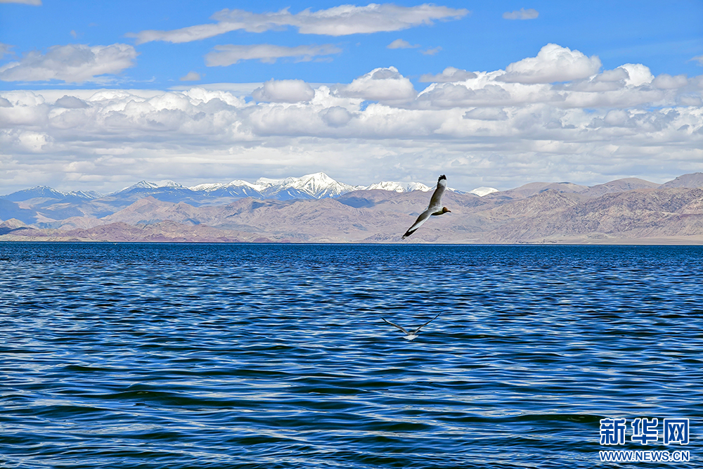 班公湖上飛翔的鳥兒(6月15日攝,無人機照片)。新華網(wǎng) 旦增努布 攝