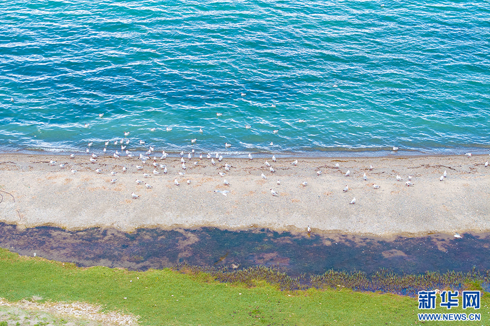 班公湖湖邊覓食的鳥類(6月15日攝,無人機照片)。新華網(wǎng) 旦增努布 攝