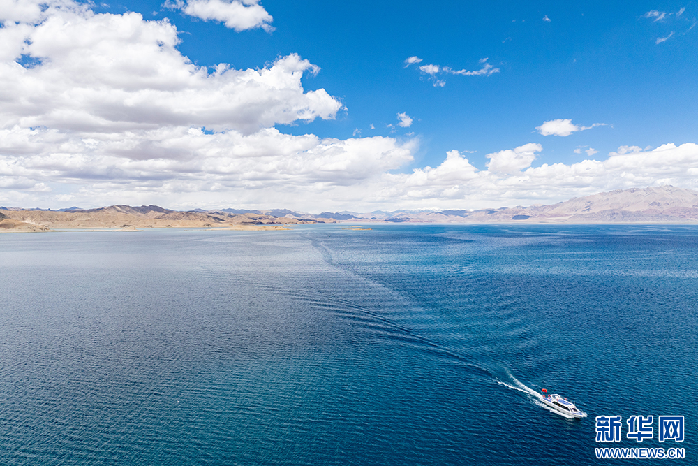 一艘游艇在班公湖上行駛(6月15日攝,無人機照片)。新華網(wǎng) 旦增努布 攝