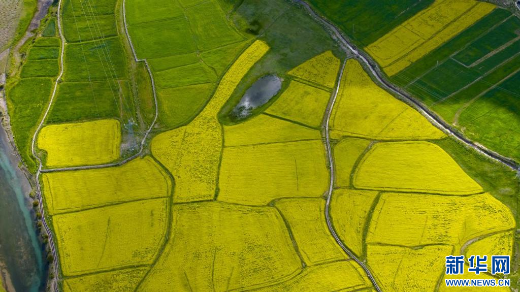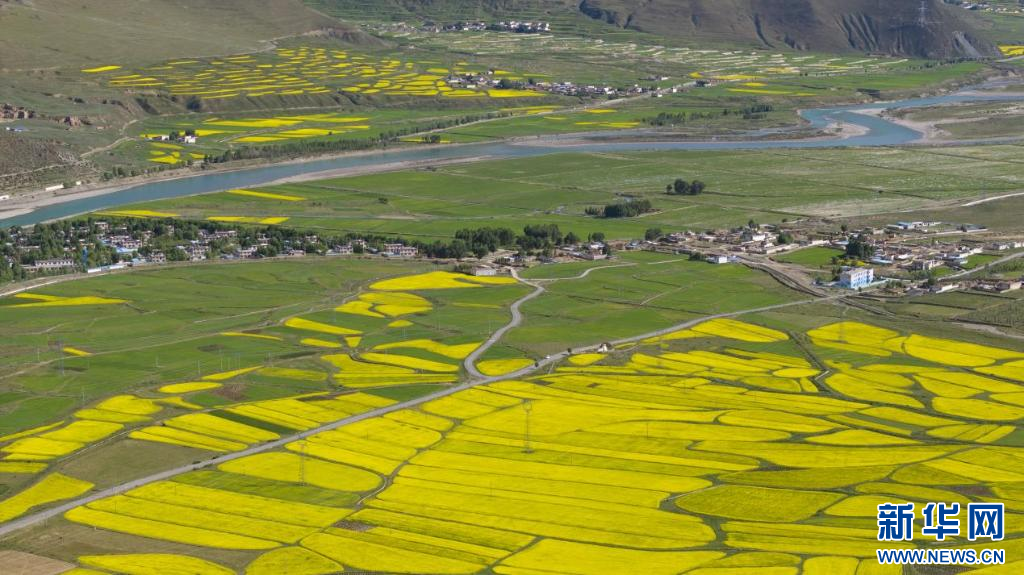 圖為7月2日拍攝的俯瞰墨竹工卡縣唐加鄉(xiāng)卓尼村油菜花田景色(無(wú)人機(jī)照片)。新華網(wǎng)發(fā) 洛克 攝
