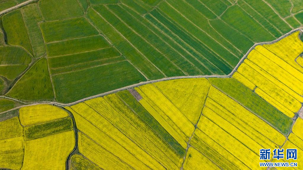 圖為7月2日拍攝的俯瞰墨竹工卡縣扎西崗鄉(xiāng)加爾多村油菜花田(無(wú)人機(jī)照片)。新華網(wǎng)發(fā) 洛克 攝