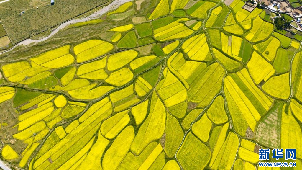 圖為7月2日拍攝的俯瞰墨竹工卡縣唐加鄉(xiāng)莫沖村油菜花田景色(無(wú)人機(jī)照片)。新華網(wǎng)發(fā) 洛克 攝