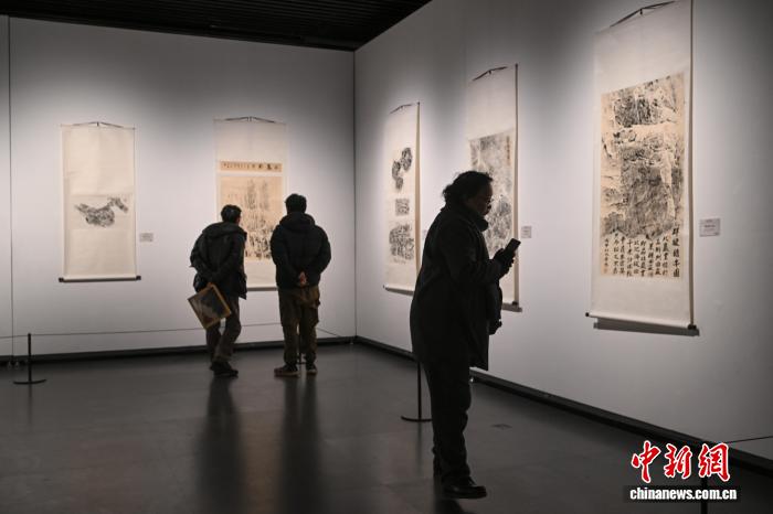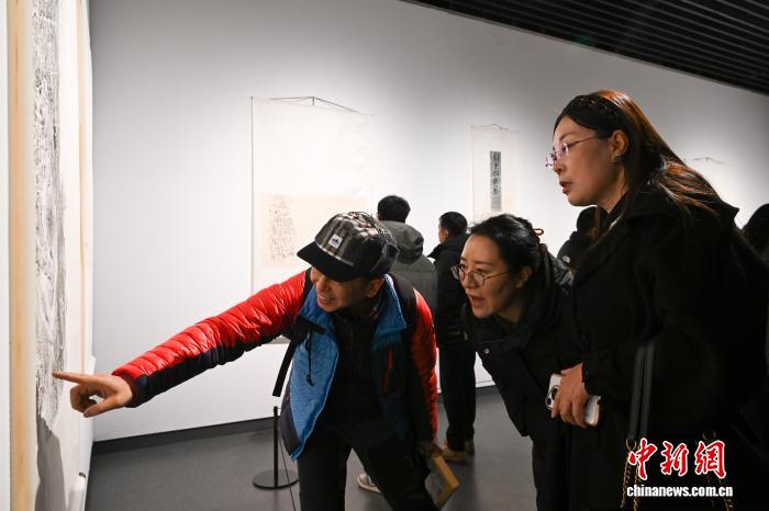 圖為觀眾欣賞展覽中的巖畫(huà)石刻拓片作品。中新社記者 貢嘎來(lái)松 攝
