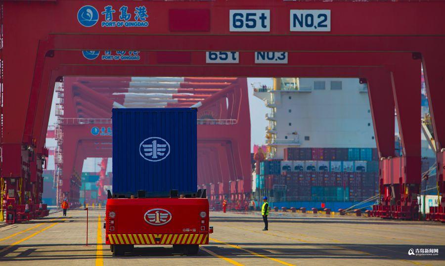 青島港全自動(dòng)運(yùn)輸車行駛中。