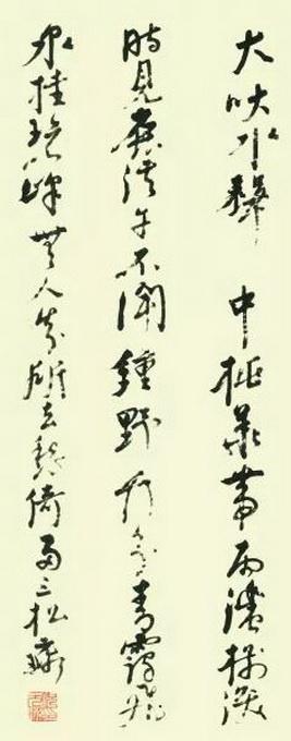 倪元璐書法流利秀雅,兼有澀勁樸茂的風(fēng)貌,風(fēng)骨凌厲,異態(tài)高古,格調(diào)曠達。用筆深得顏魯公厚實勁健之筆意,更為勁峭,結(jié)體趨于扁方,呈欹側(cè)之勢,以險寓正,風(fēng)格奇倔剛毅,自成一格。此行書豎幅《李白< ="" ="" ="" ="">》,絹本,縱103.7cm,橫60.3cm,現(xiàn)藏上海博物館。