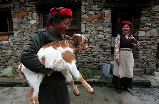 次仁央宗(右)是“薩瑪酒歌”的傳承人,這項門巴族的傳統(tǒng)藝術(shù)已經(jīng)成為國家級非物質(zhì)文化遺產(chǎn)。現(xiàn)在她正在村里修建灌渠的施工隊里打短工,一天可以掙一百元,此時被村長叫回家接受了我們的采訪。(攝影/ 邱衍慶)