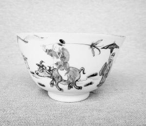 這只茶盅口徑10.5厘米,底徑4.3厘米,高8.7厘米,為粉彩瓷。茶盅表面繪有圖案,正是古人的清明踏青出游。只見群山隱約,山色朦朧,遠處氤氳一片,似乎在下著蒙蒙細雨。畫面中心位置,有一個古代裝束的老者正在緩緩前行,他笑呵呵地舉著傘,望著前面的孩童。孩童騎在一頭灰牛背上,左手拿著韁繩,右手扯著風(fēng)箏線,任由風(fēng)箏飛在天上。在他們的不遠處,有一處高大院落,層層臺閣;樹木無葉,枝條傾斜著伸向天空,就像一雙雙能夠托起太陽的手掌。在院落門前,有木條扎成的籬笆;籬笆旁邊,有兩塊圓滾滾的大石頭;石頭后面,有一棵杏樹,正燦然地開著滿樹的花朵,粉嫩粉嫩的,和青條綠葉相映成趣。
