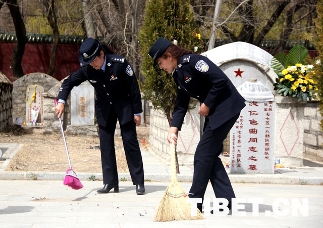 圖為西藏公安邊防總隊官兵祭掃烈士墓。