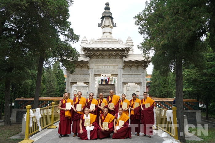 圖為中國(guó)藏語系高級(jí)佛學(xué)院第十四屆格魯派“拓然巴”學(xué)銜獲得者在西黃寺清凈化城塔前合影留念。后排右三為本文作者日巴。