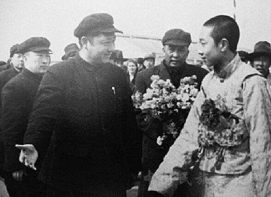 圖為1951年4月22日,習(xí)仲勛(前左)率領(lǐng)西北軍政代表熱烈歡迎途經(jīng)西安赴北京的十世班禪(前右)。 圖片來源:中國網(wǎng)