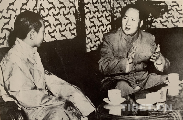 1951年4月,十世班禪親自率領(lǐng)班禪堪布會(huì)議廳主要官員到北京,受到毛澤東主席親切接見(選自大師珍藏的畫冊(cè))。(翻拍自《十世班禪大師 劉隆攝影集》)