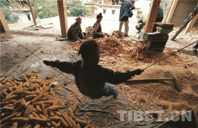 十月的鹽井正是收獲的季節(jié),金燦燦的玉米和圓潤(rùn)飽滿的核桃鋪滿了每家每戶的房頂,樹(shù)上的水果吃不及,石榴、蘋(píng)果和梨掉了一地,路邊的小孩人手一支彈弓——用來(lái)打樹(shù)上的果子吃。動(dòng)作慢的人家還在地里收割玉米、搶先一步的人家已經(jīng)在將曬干的玉米放進(jìn)脫粒機(jī)了,而運(yùn)核桃的汽車(chē)、馬幫則已經(jīng)上路。農(nóng)忙中的鹽井一派熱鬧歡騰景象。