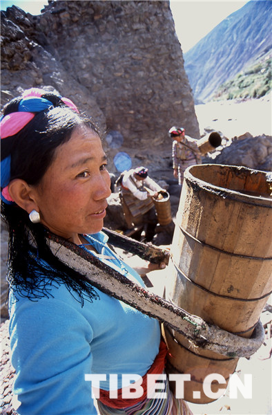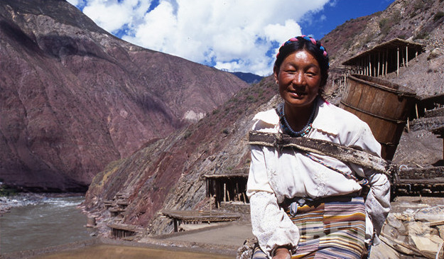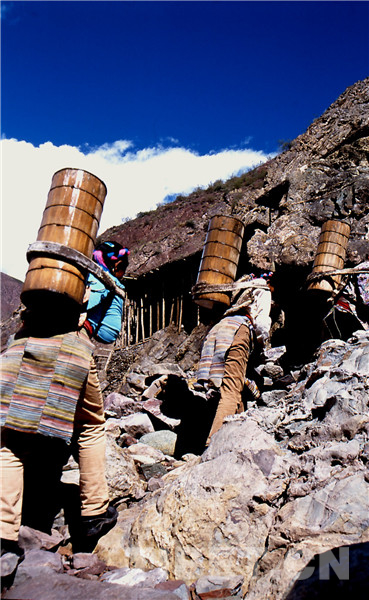 鹽田里的事自古就是由女人操持的,按她們的解釋是因為男人粗心,會弄臟了白花花的鹽,賣不出好價去。所以男人就負責運輸和銷售工作,他們會在女人已經曬出小山樣的一堆鹽巴時,趕著騾馬來把鹽馱走,然后跋山涉水到巴塘、德欽、昌都一帶,換錢糧或者茶葉。而女人就用自己的雙肩背起水桶,下到陡峭的江邊汲水,再沿著細小的棧道背到用木支架撐起的鹽田里,等無數桶鹵水將鹽田灌滿后,剩下的就是盼著陽光和風快快將水分蒸干,第二天就可以收獲了。她們就這樣日復一日年復一年地將狹窄的山路踩踏了千萬遍。