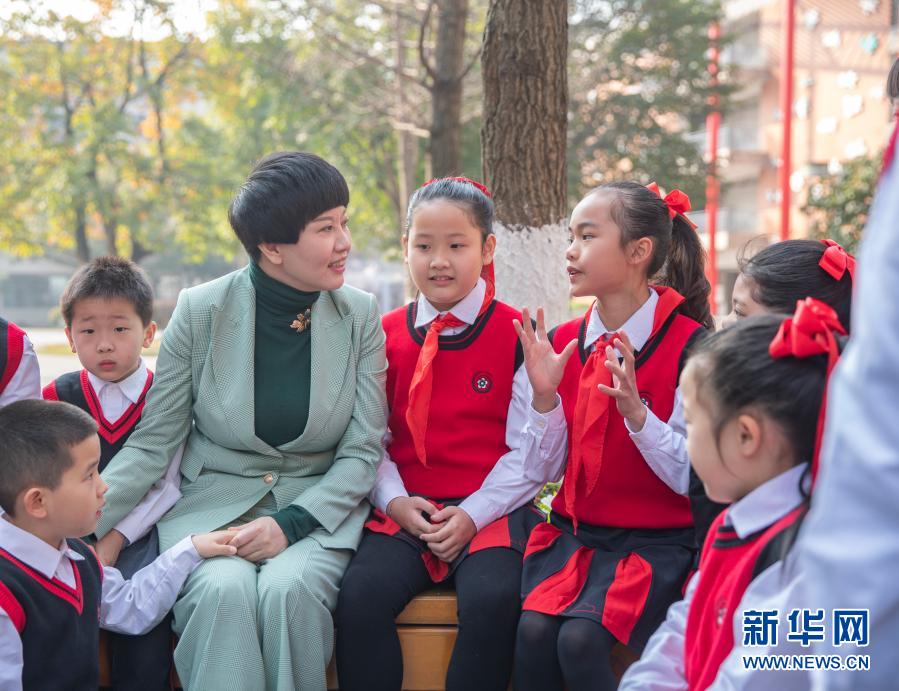2月21日,在重慶市九龍坡區(qū)謝家灣小學(xué),劉希婭(左三)在校園內(nèi)與學(xué)生們聊天。新華社記者 黃偉 攝