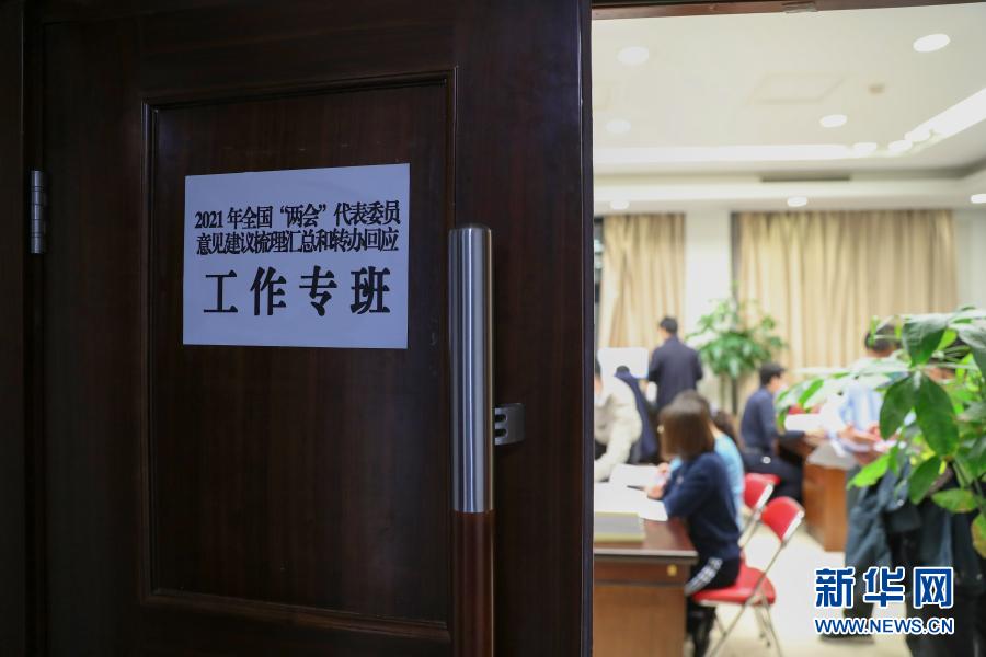 3月5日,2021年全國兩會(huì)代表委員意見建議梳理匯總和轉(zhuǎn)辦回應(yīng)工作專班的工作人員在忙碌。新華社記者 李木子 攝