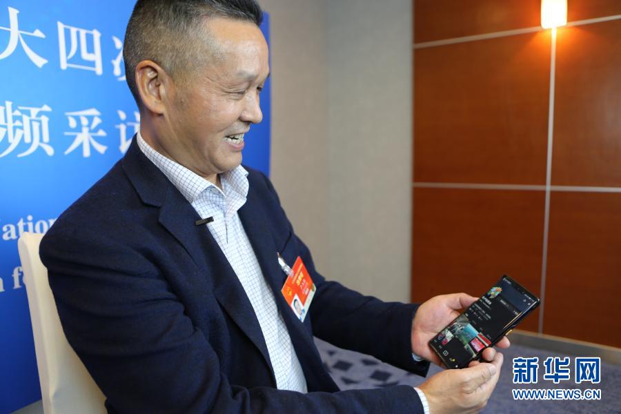 3月3日,全國人大代表、福建永泰縣希安油茶專業(yè)合作社負(fù)責(zé)人盧玉勝在駐地接受采訪時(shí)展示他為宣傳油茶開通的社交媒體賬號(hào)。新華社記者 吳雨 攝