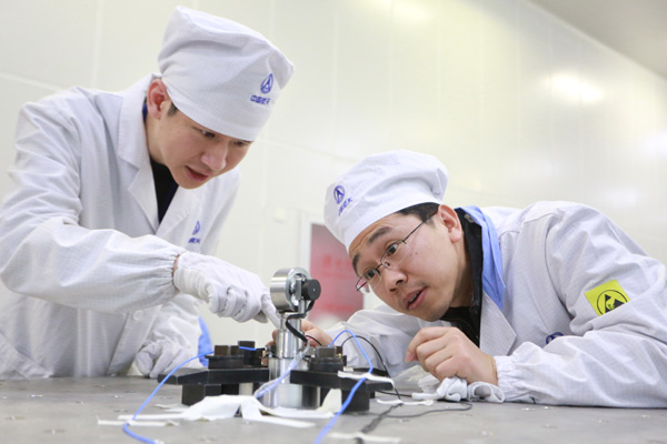 中國航天科技集團(tuán)公司的青年科研人員在做產(chǎn)品試驗(yàn)。